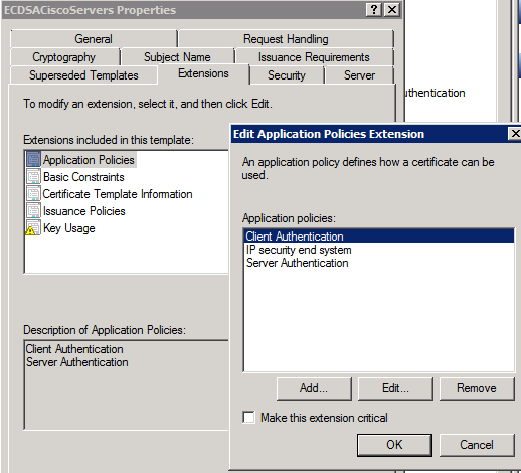 Open Powershell with Admin rights (Right Click “Run as Administrator”) and enter the following: C:\Users\admin\Desktop>certreq.exe –submit –attrib “certificateTemplate:ECDSACiscoServers” ecdsa.csr signed-ecdsa.cer