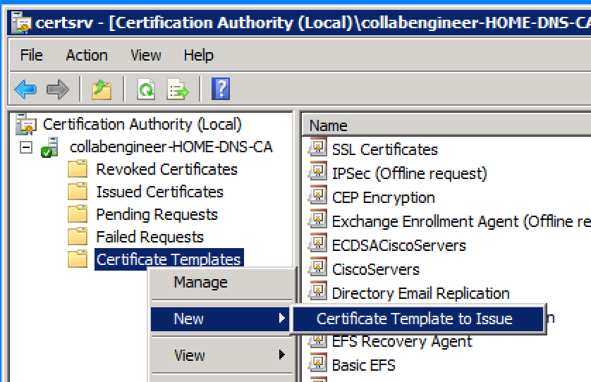Click apply and go back to the Certification Authority window –> Right click the Certificate Templates and New –> Certificate Template to Issue