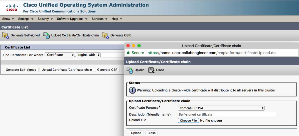 The certificate is now ready to be uploaded to the Certificate Store into UCCX ** Make sure you select Tomcat-ECDSA