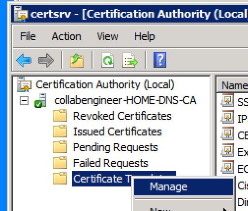 Go to Certificate Authority under Administrative Tools - Go under the Templates and Select it, Right click and Go to Manage