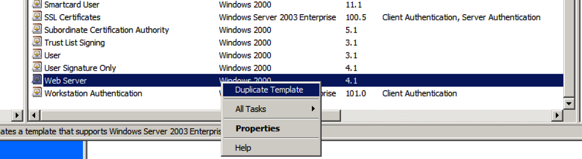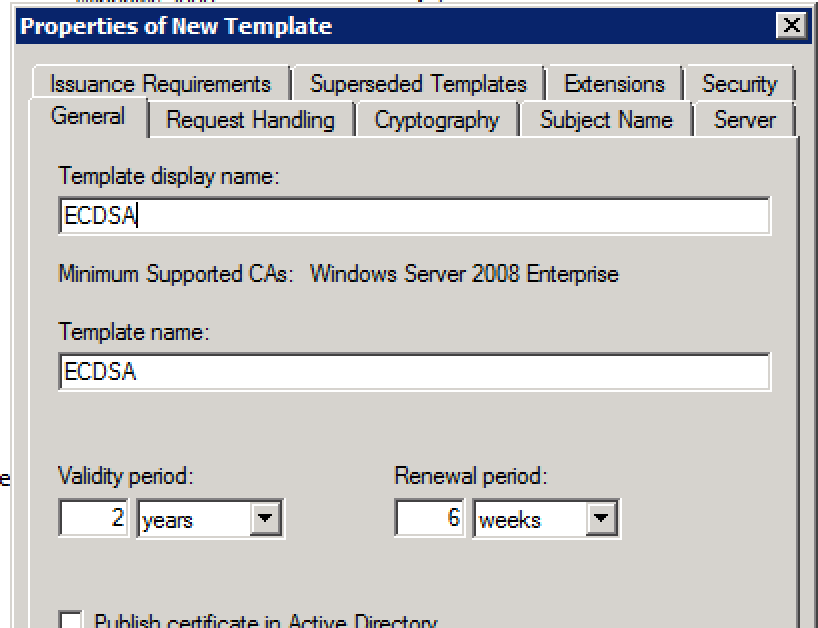 *** Note that once you select this option, Windows will ask you if you want the Windows Server 2003 or the Windows Server 2008 versions… To save you some time, here is a little hint. 2003 version is what you use to publish the template under http://CA-SERVER/certsrv (Web Enrollment) when requesting an Advanced Certificate **This is the one you use to sign the certificate for your regular Tomcat Certificate 2008 version does not let you publish the certificate template over Web Enrollment **This is what you use to sign your Tomcat-ECDSA certificate