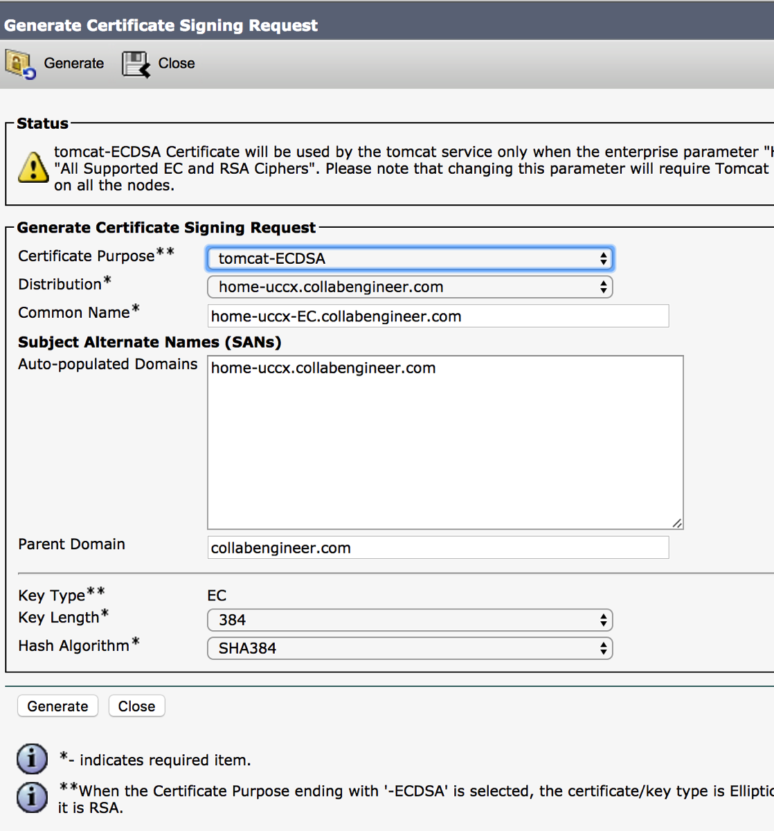 Click on the Generate CSR –> Select Tomcat-ECDSA and record the following: