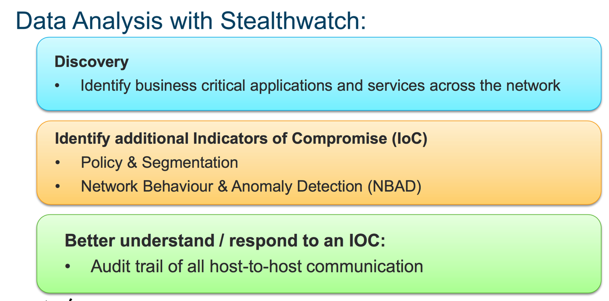 Let’s be honest, my previous minimalistic comparison earlier is not really true, this product is an engine that if well used could be very powerful. So going minimalistic again, it is a great collection engine, which uses correlation or a nice interpretation of what is going on the Network Infrastructure. Remember this, Data, Big Data, analytics, are you familiar with that? - well, that is what this engine does best. And don’t forget that backstage you have the Smart guys from Cisco Talos, providing Global intelligence for StealthWatch traffic collection.