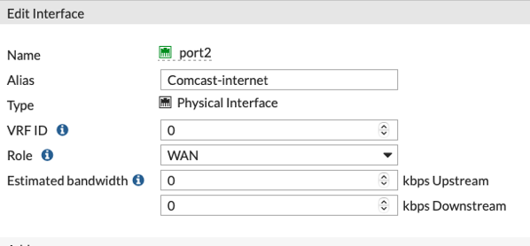 Internet 1 - I’m using Comcast for this one - but all the routing to Comcast happens in the backend, Add an Alias to help you identify the interface; the Role is an interesting one because it allows you to modify important information based on what you choose, when selecting WAN, like in this port, there will be more options available, and some options will be disabled, as follows: