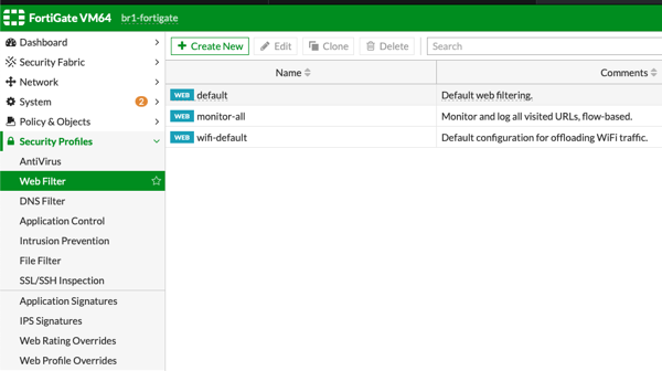 FortiOS has a neat section for all the Security Profiles; this GUI is straightforward and intuitive. So let’s see what we have by default.