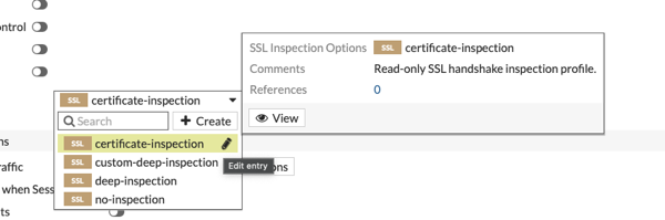 So I will select the less disruptive option, which is the certificate-inspection. This one is a read-only SSL Handshake profile.