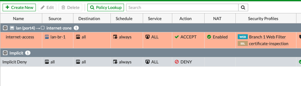 As mentioned before, this profile needs to be applied to our Firewall Policy. We need to locate the policy that matches our traffic and apply the Web Filter profile. Our lab is super simple; we only have 1 Firewall policy. If you look at the Column called Security Profile, we are not running any inspection. And we have no other Security Profiles assigned to it.