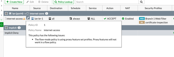 After looking at a few things, I noticed that I had 2 things I needed to correct. The one Firewall Policy I had, was configured initially as Flow-Based, so I got a warning.
