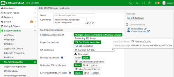 Note that when this Web Filter is selected, there will be a warning next to SSL Inspection. It basically says that this profile should not be selected with any other UTM Security Profiles/Features, as our config may not apply.