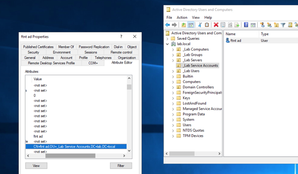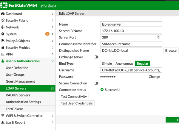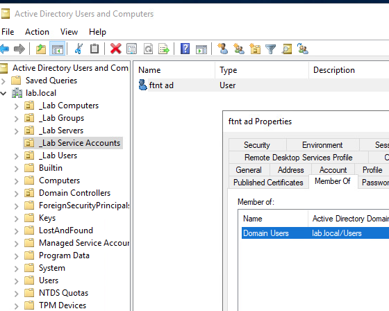 Domain Distinguished Name –> DC=lab,DC=local Username Distinguished Name –> CN=ftnt ad,OU=_Lab Service Accounts,DC=lab,DC=local