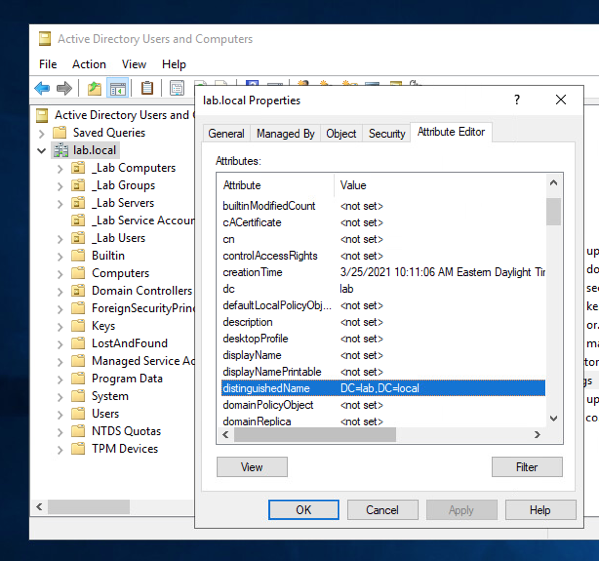 Make sure you right-click the domain, in my case lab.local –> Select Properties –> Select Attribute Editor –> Scroll down to DistinguishedName