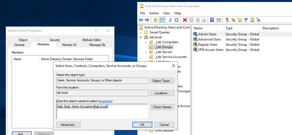 Last, you will create a security Group; we will use it to add our Firewall Administrators to it. My lab will provide access to the Help Desk Administrator Account. The name of my group is Admin Users