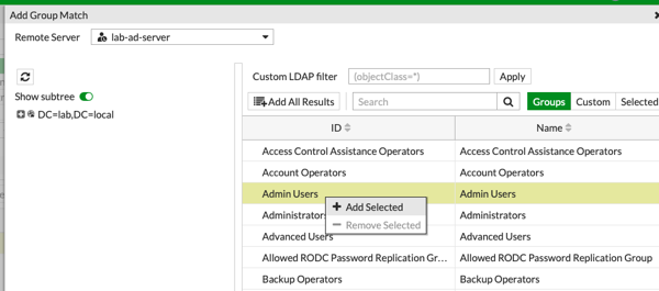 We are adding our Remote Group that will be the only Group from AD authorized to log in and Manage the FortiGate. From the previous step, this is going to be our Admin Users group. There are all sorts of ways to use the LDAP Explorer from FortiGate, but most likely, your Groups will be listed first, just like in the image. Make sure you right-click the Group and select “Add Selected,” then you click OK.