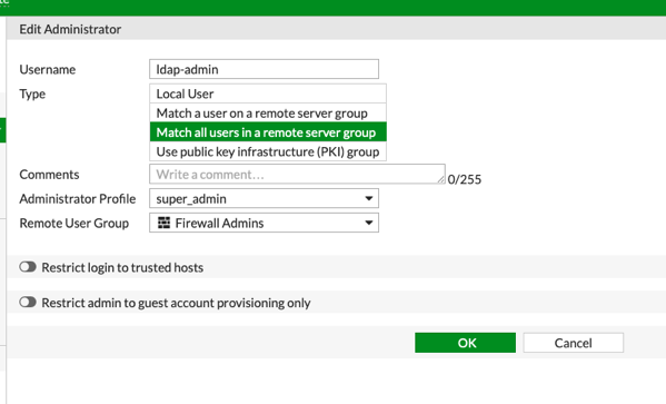 This section seems symbolic and a bit weird to me because we are creating an Administrator Account. Instead, we are telling FortiGate to leverage our LDAP Group for authentication.