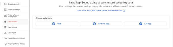 Next we are going to land under the Data Streams section - In my case I would like to use Web as my platform