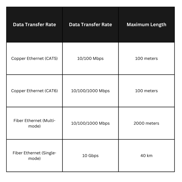 The chart compares different types of fiber and Ethernet cables and their respective speeds and maximum lengths. Copper Ethernet, also known as CAT5 and CAT6, supports data transfer rates of 10/100 Mbps and 10/100/1000 Mbps respectively and has a maximum length of 100 meters.