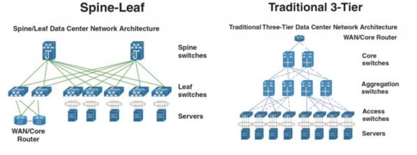 The spine-and-leaf network topology is a variation of the three-tier network topology, where the core layer is split into two parts: a spine and a leaf.