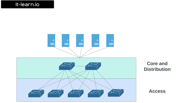 This architecture is often used in smaller networks, where a more complex three-tier topology is not needed. However, it may not be as scalable as a three-tier topology, and it may not provide as much isolation between different parts of the network, making it harder to manage and troubleshoot in case of failure.
