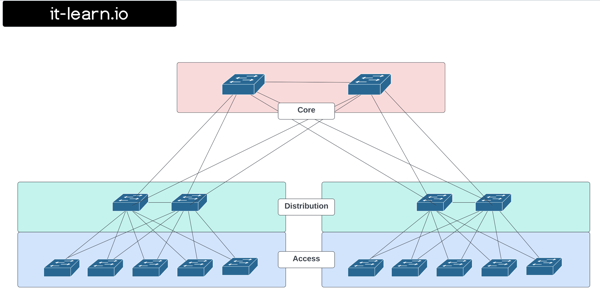 Core: The third tier is the core layer which is the backbone of the network. It comprises of high-speed switches and routers that provide high-speed connectivity between the distribution and access layers. This layer is responsible for providing fast and reliable data transfer, and it’s optimized for low latency and high throughput.