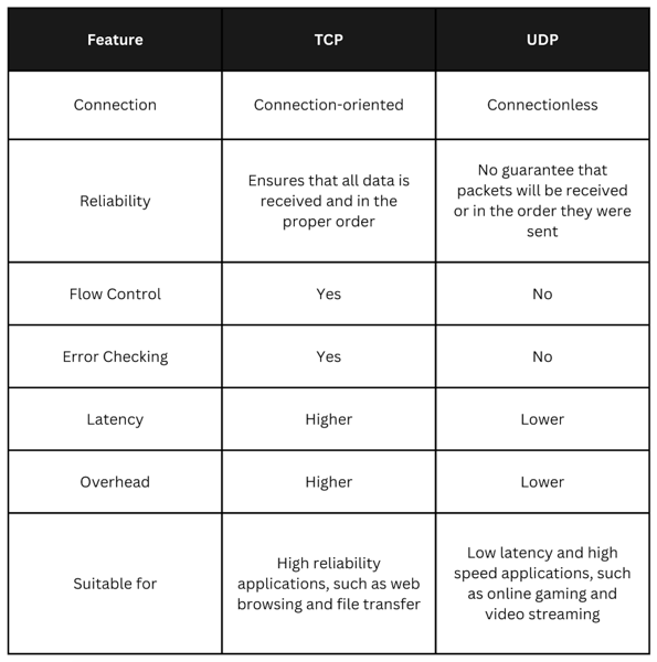 UDP, on the other hand, is a connectionless protocol, which means that there is no virtual connection established between the sender and the receiver. Instead, data is sent as individual packets, with no guarantee that they will be received or in the order they were sent. Because of this, UDP does not include flow control or error-checking mechanisms. However, this also means that UDP is faster and has lower overhead than TCP, making it suitable for applications that require low latency and high speed, such as online gaming, video streaming, and VoIP.