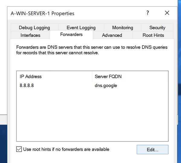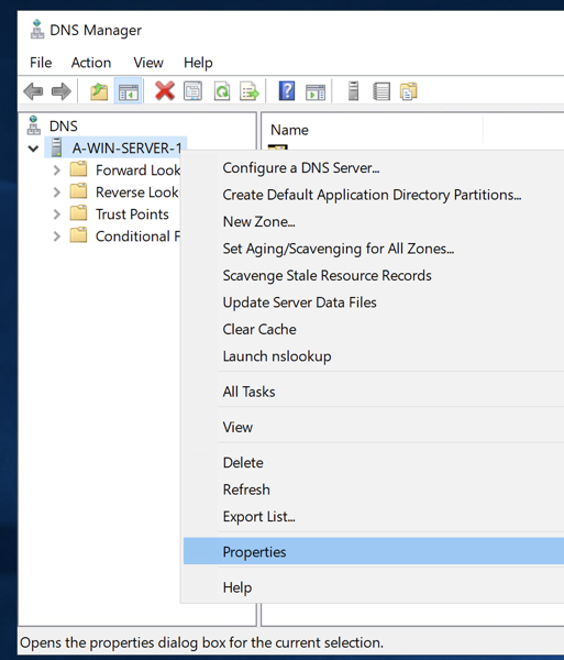 Once you are there Right-Click your Server name –> Select Properties –> Go to the Forwarders Tab