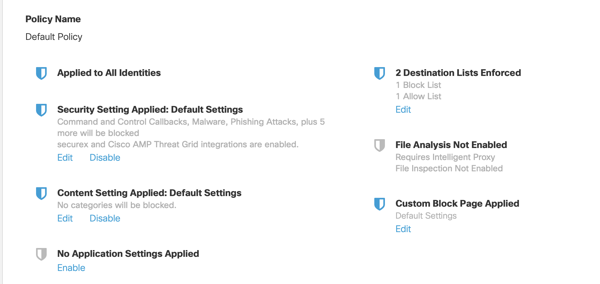 Umbrella comes with a default policy for DNS Security, but you may want to tweak it and play with it. At this point your Network will play the role of the identities you can apply this policy to. The next step should be to take a look at these policies