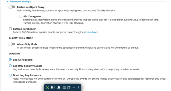 The next piece will be your Advanced Settings, every DNS Policy will have this section. This is where you will enable and configure Intelligent Proxy and SSL Inspection, which is used to inspect HTTPS traffic.